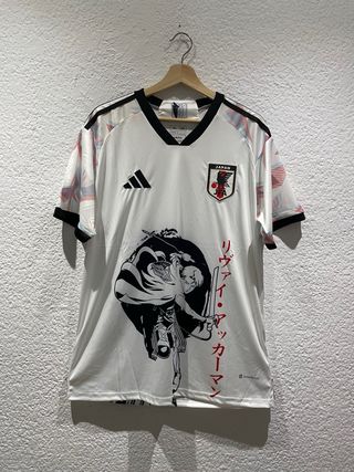 Camiseta de la selección de Japón con diseño inspirado en Levi Ackerman de Attack on Titan. - Diseño frontal con ilustración de Levi. - Manga con estampado gráfico. - Cuello en V con detalles. - Escudo de la JFA