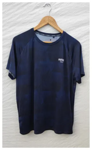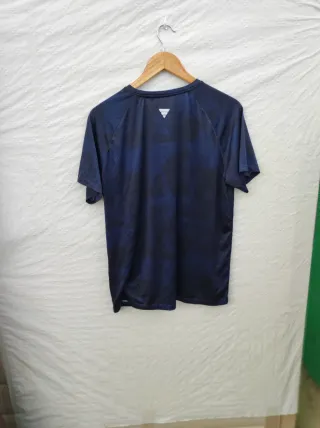 Camiseta deportiva con un diseño moderno y estampado. - Diseño con estampado en tonos azules y negros. - Cuello redondo y mangas cortas. - Logo de la marca en el pecho.