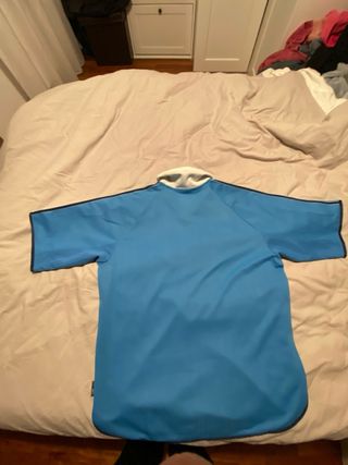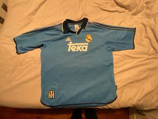 Camiseta de fútbol del Real Madrid de la temporada 1999. Tercera equipacion, pedir mas fotos si necesitais. Esta sacada de un armario despues de muchos años. Precio orientativo, preferiblemente en mano pero escucho cualquier ofertas. - Diseño clásico con cuello. - Logo de Adidas y escudo del club. - Patrocinador Teka.