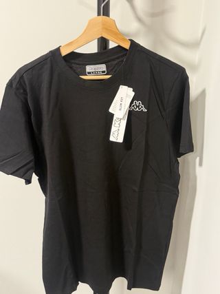 Camiseta negra de la marca Kappa, con corte slim fit. Es una prenda nueva a estrenar, ideal para un estilo casual. - Logo de Kappa bordado en el pecho. - Cuello redondo. - Manga corta.