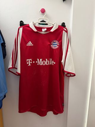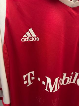 Camiseta de fútbol del Bayern de Múnich. - Diseño clásico en color rojo y blanco. - Logo de Adidas en el pecho. - Escudo del club en la manga. - Dorsal con nombre desgastado.
