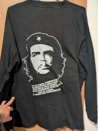 Camiseta negra de manga larga con diseño de la banda BOIKOT. Cheguevara en el dorsal. Agujero en una manga como se ve en la foto, se puede coser, muy chula. - Estampado frontal con estrella roja y texto amarillo. - Cuello redondo. - Manga larga.