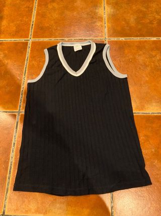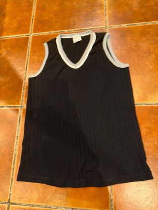 Camiseta sin mangas de la marca Nina. Diseño de canalé con ribetes en cuello y sisas. - Cuello en V. - Ribetes en gris claro y blanco.