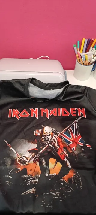 Camiseta negra con estampado de Iron Maiden, modelo The Trooper. Por ambos lados. NUNCA SE HA USADO. - Diseño frontal con Eddie y la bandera británica. - Manga corta. - Cuello redondo.