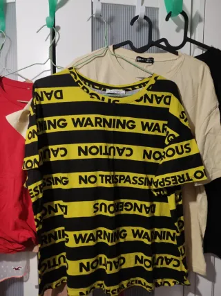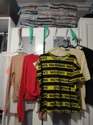 Lote de seis camisetas varios estilos - Camiseta blanca con estampado. - Camiseta beige de manga larga. - Camiseta roja. - Camiseta amarilla con estampado de letras negras. - Camiseta beige. - Camiseta negra.
