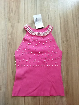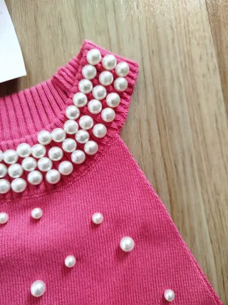 Camiseta sin mangas de color fucsia, adornada con perlas. - Cuello alto con detalle de perlas. - Diseño con perlas distribuidas por toda la prenda. - Tejido de punto.