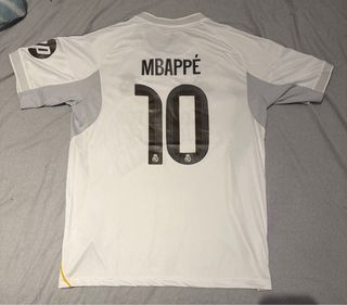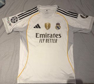 Camiseta de fútbol del Real Madrid. - Diseño con detalles grises y amarillos. - Logo de Adidas y escudo del club. - Inscripción 'Emirates Fly Better'.