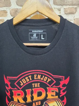 Camiseta con un diseño llamativo inspirado en el estilo Harley Davidson. - Tallaje ancho 190gms, bastante denso. -Desde la S hasta XXL. - Estampado frontal con calavera, pistones y llamas. - Mensaje Just Enjoy The Ride And Wind. - Detalle Biker Wear Brand en la parte inferior.