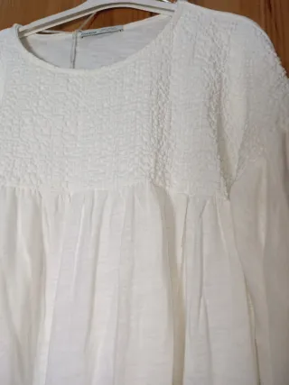 Camiseta blanca de Pull&Bear con un diseño moderno y cómodo. - Parte superior con textura. - Mangas abullonadas. - Corte holgado. - Axila mide 60 cm - Largo mide 60 cm - En la parte de arriba tiene a modo canesú. - Algodón, poliéster