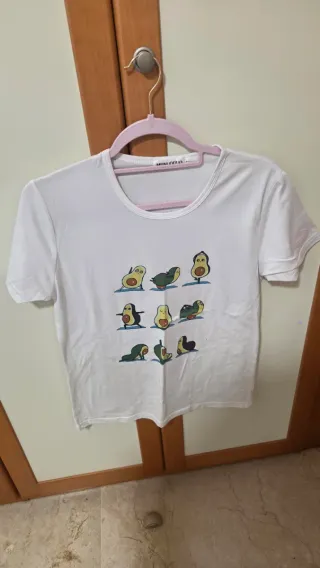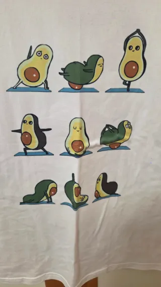 Camiseta blanca con un divertido estampado de aguacates haciendo yoga. Ideal para un look casual y original. - Diseño de aguacates en diferentes posturas de yoga. - Manga corta. - Cuello redondo.