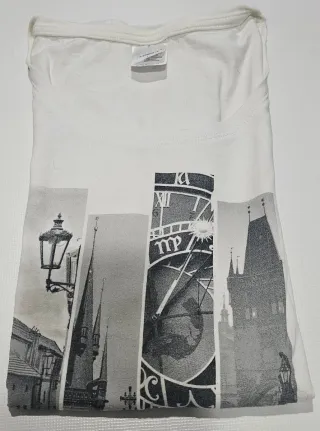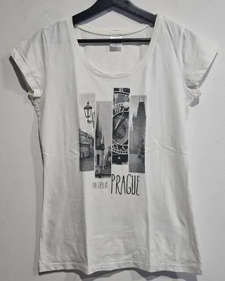 Camiseta blanca con estampado gráfico de la ciudad de Praga. - Diseño de collage con imágenes de la ciudad. Falta de planchado por no tener plancha.🤗 Sisa 46cm. Ref3