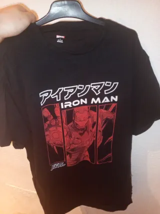 Camiseta negra con diseño de Iron Man. - Estampado frontal con Iron Man y texto en japonés. - Logo de Marvel en la etiqueta. - Talla L (42-44 / 52-54).