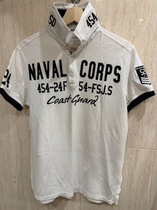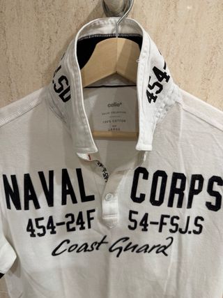 Camiseta de manga corta con un diseño inspirado en la Naval Corps y Coast Guard. - Cuello tipo polo con detalles impresos. - Cierre de botones en la parte frontal. - Parche con número en la manga. - Tejido 100% algodón.