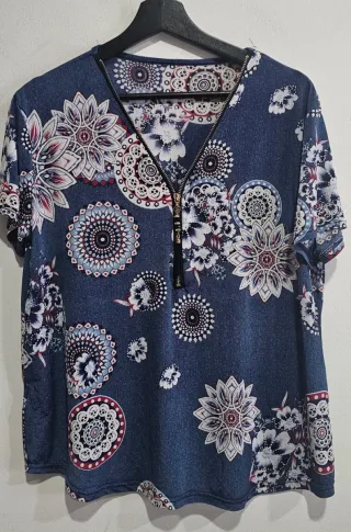 Camiseta con un diseño llamativo. - Estampado floral y de mandalas. - Cuello en V con cremallera. - Manga corta. Falta de planchado por no tener plancha.🤗 Sisa 52cm. Ref3