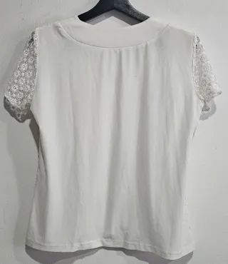 Elegante camiseta de manga corta con un delicado tejido de encaje. - Diseño de encaje floral. - Cuello redondo con detalle, con hombreras. - Mangas cortas con borde festoneado. Sisa 52c. Ref3