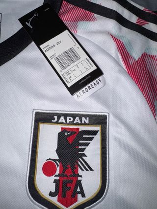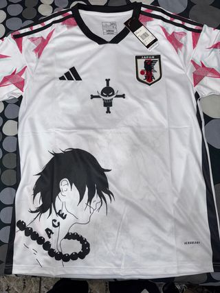 Camiseta de fútbol de Japón con diseño inspirado en One Piece. - Diseño frontal con el logo de Barbanegra y Ace. - Mangas con estampado de estrellas rojas y blancas. - Logo de la marca y escudo de la JFA en el pecho.