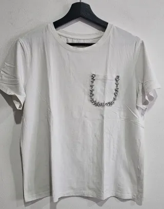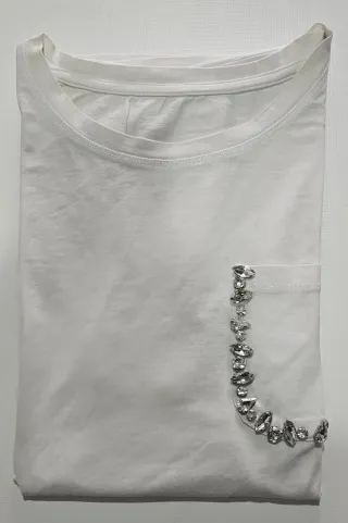 Camiseta blanca con un detalle de pedrería en el bolsillo. - Diseño moderno y elegante. - Tejido suave y cómodo. Falta de planchado por no tener plancha.🤗 Sisa 52cm. Ref3