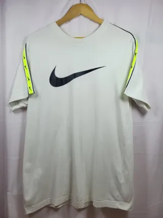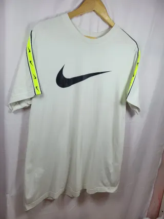 Camiseta blanca con estampado negro marca Nike. Talla L. No tiene ningun fallo. Medidas: Largo: 80 cm. Pecho (sin entorno): 50 cm. Hombro a hombro: 46 cm.