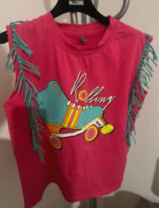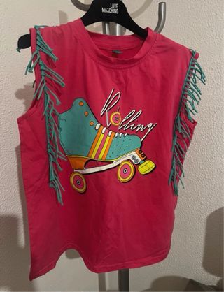 Camiseta de la marca Lolina en color rosa fucsia con un diseño de patín retro muy colorido. Flecos en las mangas. • Estilo: Retro, perfecta para festivales o un look urbano original. • Fit: Talla L (corte recto). • Medidas: Sisa a sisa 49 cm / Largo 56 cm.