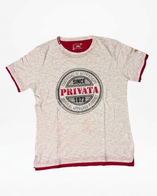 Camiseta jaspeada con detalles en rojo. - Diseño circular con texto Since Privata 1973. - Cuello y mangas con ribete rojo. - Tejido jaspeado con finas líneas.