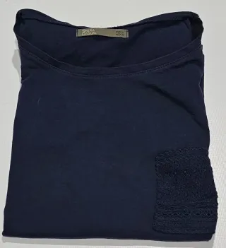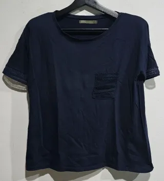 Camiseta de manga corta con detalles de encaje en los puños y un bolsillo en el pecho. - Color azul marino. - Cuello redondo y con hombreras. - Tejido suave y cómodo. - Diseño moderno, blosillo con detalles de encaje. Falta de planchado por no tener plancha.🤗 Sisa 50cm. Ref3