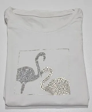 Camiseta de manga corta con un diseño original. - Estampado frontal de dos flamencos con pedrería. Falta de planchado por no tener plancha.🤗 Sisa 50cm. Ref3