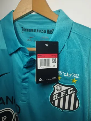 Camiseta de fútbol retro del Santos FC, con un diseño clásico y llamativo. - Escudo del club S.F.C. en el pecho. - Logo de Nike bordado. - Inscripción 1912 - 2012 conmemorativa. - Patrocinador BMG en grande. - Inscripción en el cuello MOMENTO DE VALER DESDE 1912.