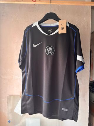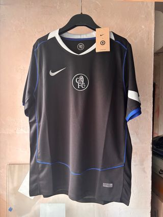 Camiseta de fútbol del Chelsea FC, modelo Total 90 de la temporada 25/26. - Diseño en color negro con detalles en azul. - Cuello blanco. - Logo de Nike y escudo del club bordados.