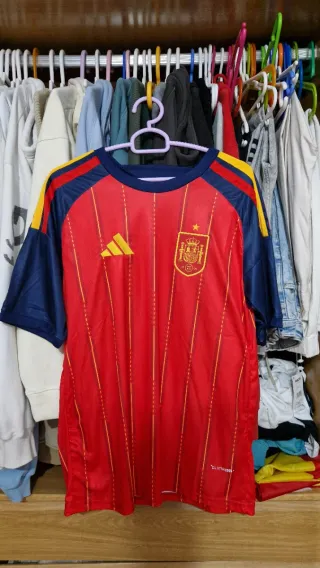 Camiseta España de fútbol. - Diseño con franjas verticales rojas y detalles en azul y amarillo. - Escudo de España bordado en el pecho. - Logo de Adidas en el pecho.