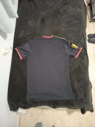 Camiseta de fútbol con un diseño moderno y llamativo. - Diseño con detalles en rojo y negro. - Logo del equipo en el pecho. - Logo de la marca deportiva. - Cuello redondo.