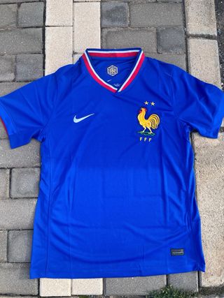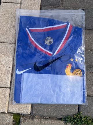 Camiseta de la selección francesa de fútbol. - Diseño con el escudo de la federación y el gallo. - Logo de Nike. - Detalles en rojo y blanco en el cuello.