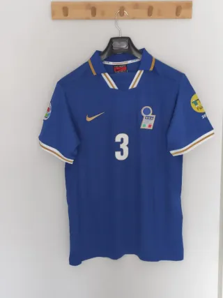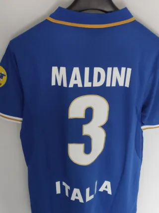 Camiseta de fútbol retro de Italia, con el número 3 del gran Paolo Maldini - Talla XL en etiqueta pero da talla como una L - Diseño clásico de la selección italiana. - Detalles dorados en cuello y mangas.
