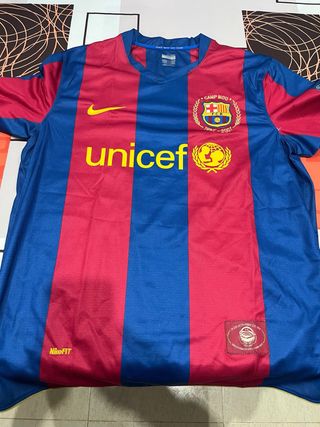 Camiseta de fútbol del FC Barcelona, edición especial. - Diseño a rayas rojas y azules. - Logo de Nike y Unicef. - Detalle conmemorativo Camp Nou 1957-2007. - Piqué