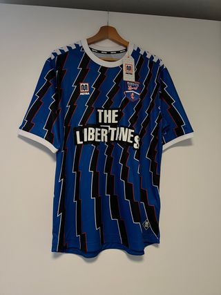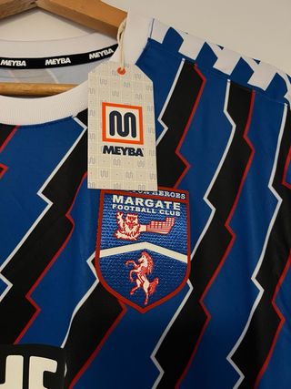 Camiseta de fútbol Meyba del Margate FC para la temporada 25/26. Nueva a estrenar. The Libertines - Talla L. - Diseño con rayas azules, negras y blancas. - Logo de Meyba en la manga y el pecho. - Escudo del Margate FC en el pecho.