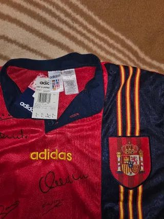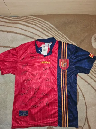 Camiseta de la selección española de fútbol de Adidas, modelo de 1996. Confeccionada en un diseño bicolor rojo y azul. Edicion especial con las firmas de los 22 convocados, original y con etiquetas de la época. - Talla L. - Logo de Adidas bordado. - Escudo de la RFEF en el pecho.
