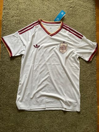 Camiseta de fútbol de la selección española. - Diseño clásico con detalles en rojo y dorado. - Mangas cortas con las icónicas tres rayas de Adidas. - Escudo de España bordado en el pecho. - Tecnología ClimaCool para una óptima ventilación.