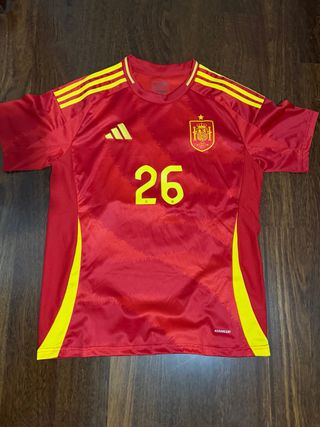 Camiseta de fútbol de España con el dorsal 26, talla L. Diseño deportivo con detalles en amarillo. - Logo de Adidas. - Escudo de la selección española. - Tecnología Aeroready.