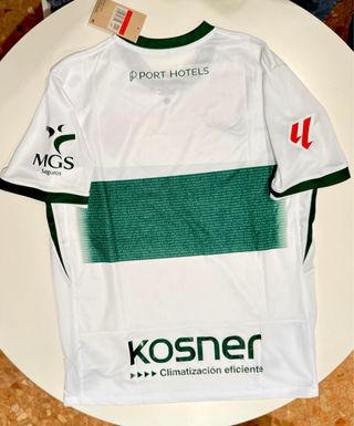 Camiseta del Elche Club de Fútbol de la talla L. Presenta un diseño moderno con detalles distintivos. - Escudo del Elche CF bordado. - Logo de Nike en el pecho. - Patrocinador principal Vega Fibra en el frontal. - Detalles en verde en cuello y mangas. - Tejido transpirable.