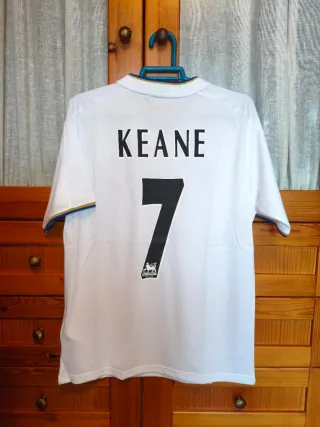 Camiseta de fútbol blanca con el nombre Keane y el número 7. - Nombre: Keane - Número: 7 - Diseño con detalles en azul y dorado en el cuello.