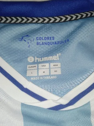 Camiseta oficial del Málaga Club de Fútbol de la marca Hummel. Diseño a rayas verticales blancas y celestes. - Escudo del club en el pecho. - Logo de Hummel. - Inscripción málaga en grande. - Detalle UAX Universidad Alfonso X El Sabio en la manga.
