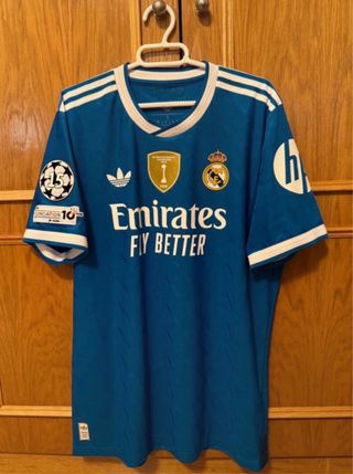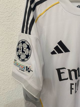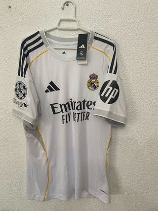 Camiseta de fútbol del Real Madrid. - Diseño con cuello redondo y detalles blancos. - Escudo del club y logo de Adidas. - Patrocinador Emirates Fly Better en el frontal. - Parche de campeón de la Champions League. - Logo de HP en la manga derecha. - Insignia de la Fundación Real Madrid en la manga izquierda.