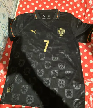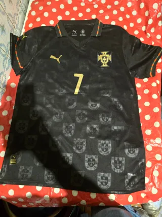 # Descripción del Producto **Camiseta Selección Portuguesa de Fútbol - Ronaldo #7 (Edición Especial "Pantera Negra")** --- ## 🎽 Características - Color **negro** con detalles en dorado - Nombre **RONALDO** y dorsal **#7** en dorado en la espalda - Escudo oficial de la **FPF** (Federación Portuguesa de Fútbol) bordado en dorado en el pecho - Logo **Puma** en dorado - Estampado de escudos de Portugal en tono negro sobre negro en toda la prenda - Ribetes tricolores (verde, rojo y amarillo) en el cuello y mangas — colores de la bandera portuguesa - Cuello tipo polo con apertura en V - Inscripción **"PANTERA NEGRA"** en el cuello in