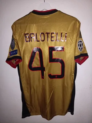Camiseta de fútbol retro con el nombre Balotelli y el número 45. - Diseño con detalles dorados y negros. - Talla L -