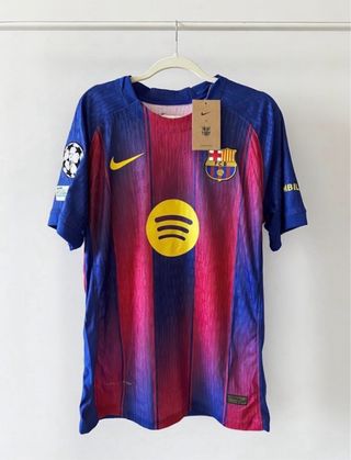 Camiseta de fútbol para niño con el diseño clásico del Barça. Temporada 24/25 - Producto oficial - Mangas cortas. - Cuello redondo. - Escudo del club en el pecho. - Logo de Spotify en el frontal. - Parche de la Champions League en la manga.