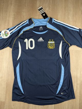 Camiseta de fútbol de Argentina con el número 10 y el nombre de Riquelme, Mundial de Alemania 2006. Talla : M ( hay S y L tambien ) - Diseño clásico de la selección argentina. - Detalles en azul claro y dorado en cuello y mangas.