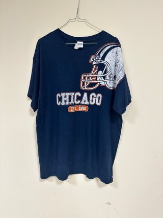 ✨Camiseta fútbol americano de Chicago con casco y que hace referencia a los Chicago Bears fundados en 1919 ➕Color Azul marino ➕Dibujo en la zona frontal con tonos en blanco ➕Talla L ✔️Muy buen estado general #hazlovintage #oversizedlook #camiseta #chicagobears #chicagovintage #casual