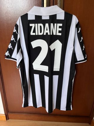 Talla pequeño, equivale a una L Camiseta de fútbol de la Juventus con el dorsal y nombre de Zidane. - Diseño a rayas blancas y negras. - Logo de Kappa en las mangas. - Cuello tipo polo.