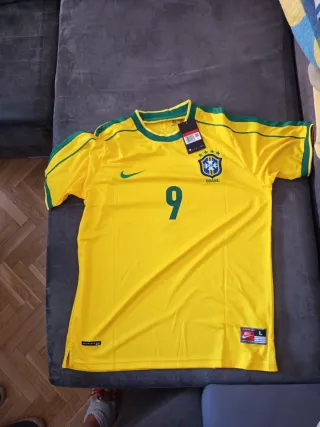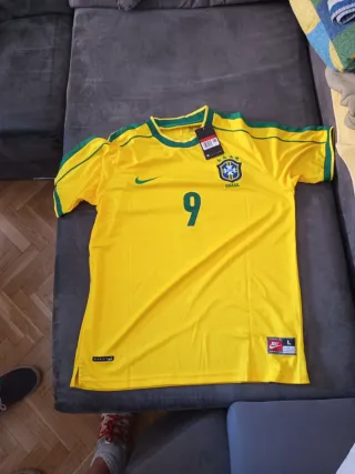 Camiseta de fútbol de Brasil. - Diseño con el número 9. - Logo de Nike. - Escudo de Brasil con estrellas.