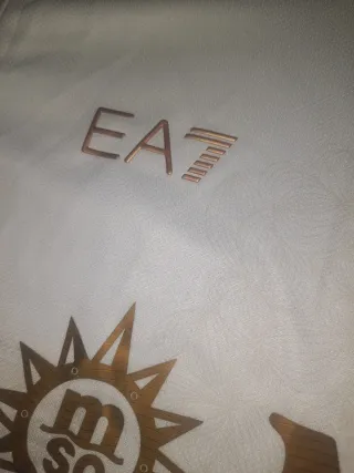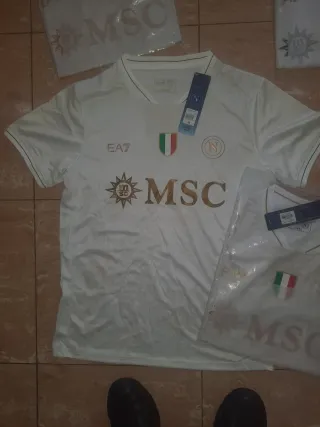 Camiseta de fútbol del Napoli. Edición fan 13€ Edición player 18€ - Diseño en color blanco con detalles dorados. - Escudo del equipo y logo de EA7. - Bandera italiana en la parte frontal.