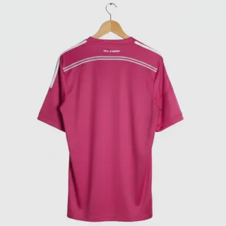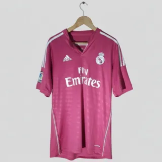 Camiseta de fútbol del Real Madrid de la temporada 2014-2015. Diseño en color rosa con detalles blancos. - Logo de Adidas. - Escudo del Real Madrid. - Patrocinador Fly Emirates.